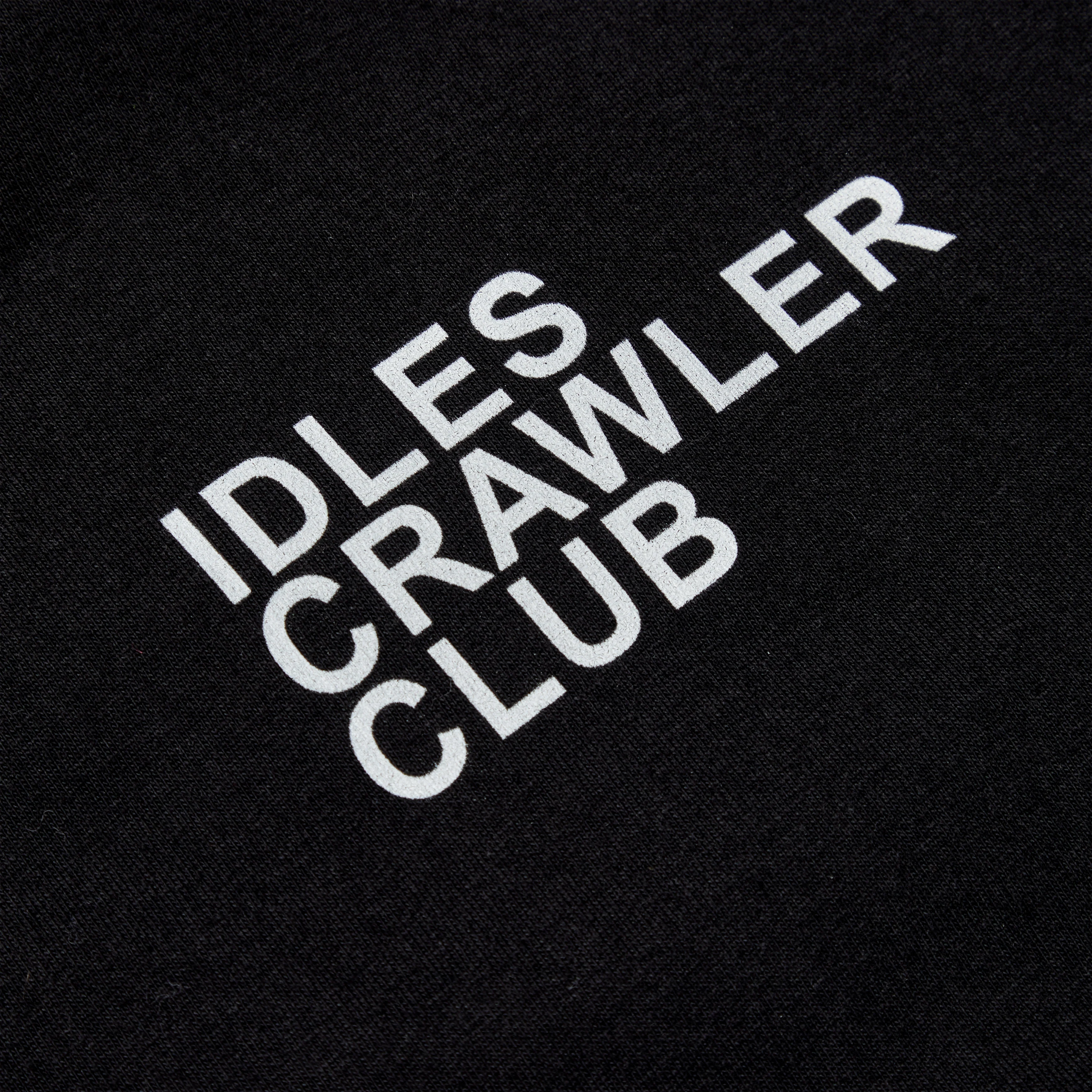Black t-shirt with IDLES CRAWLER CLUB screen printed on the front chest with snake imagery and 'We're Not Fighting, We're Just Dancing' on the back.