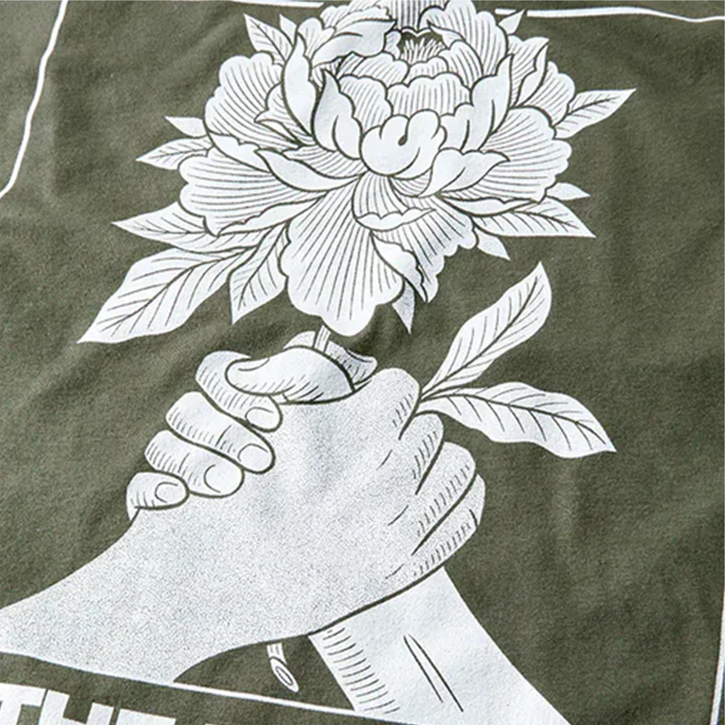 Green t-shirt with IDLES and 'Be The I In Unify' screen printed on the front with flower and clasping hand design.
